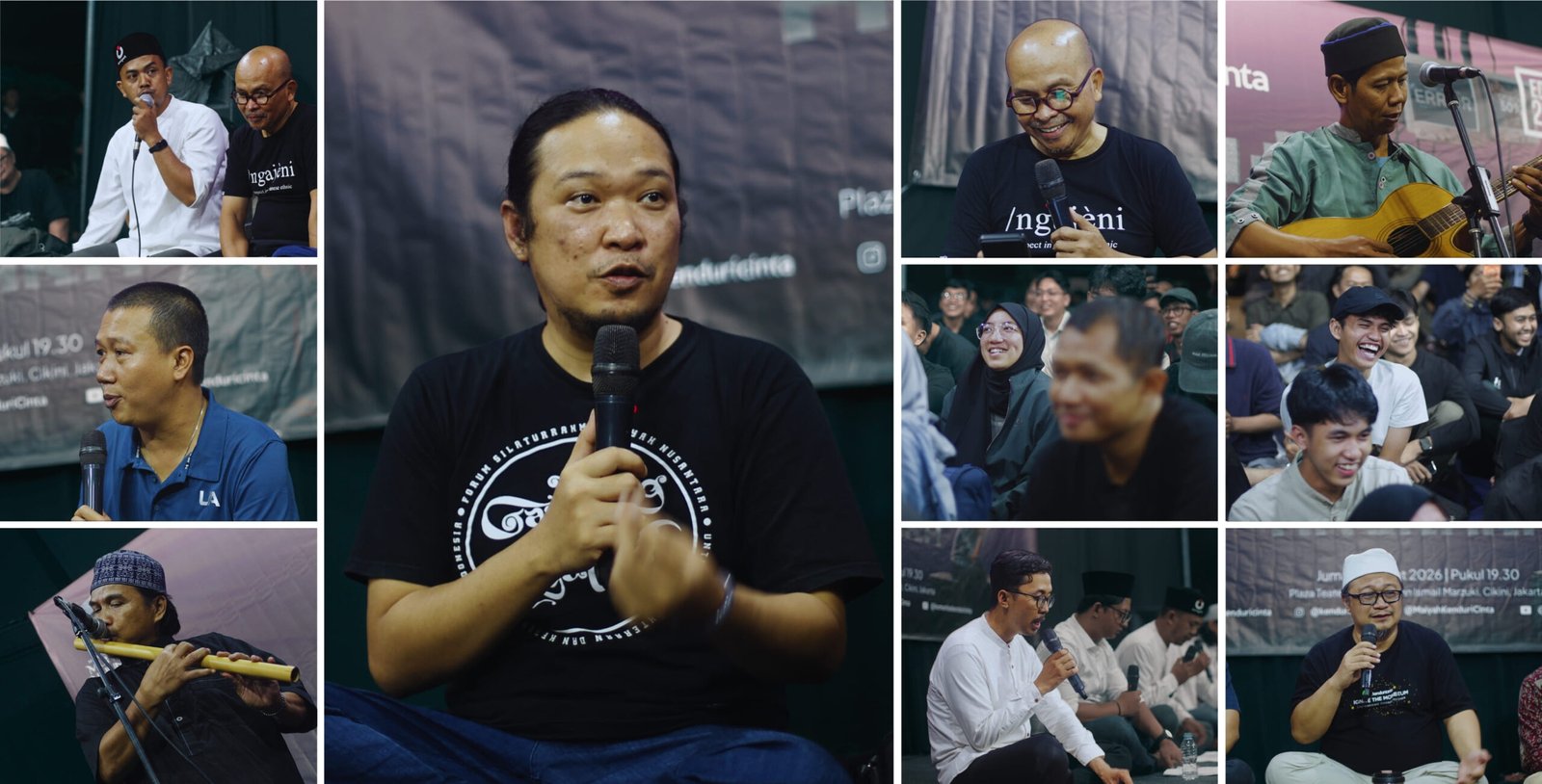 HUJAN turun hampir sepanjang hari, bahkan semakin deras menjelang acara dimulai—seolah berkah ditumpahkan tanpa jeda pada hari itu. Menjelang malam, hujan akhirnya mereda, memberi kesempatan para penggiat untuk kembali merapikan area tenda dan panggung Kenduri Cinta di Plaza Teater Kecil, Taman Ismail Marzuki. Satu per satu jamaah mulai berdatangan; sebagian masih menenteng payung yang basah, sebagian lainnya melangkah cepat agar segera mendapatkan tempat di bawah tenda. Meski tanah masih lembap oleh sisa hujan, kehadiran mereka tetap mengalir—membawa semangat untuk kembali berkumpul dan sinau bareng di malam itu.